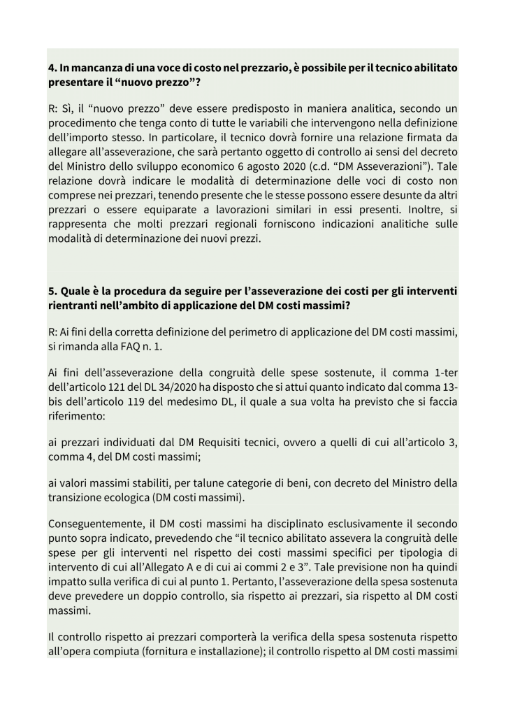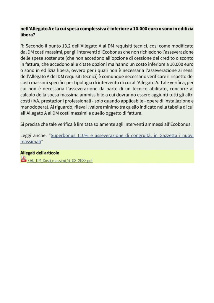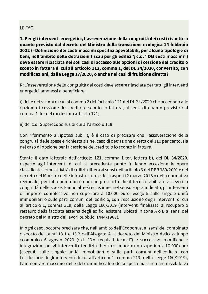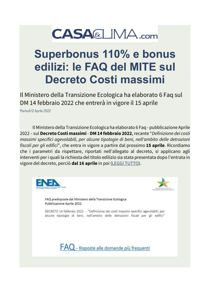 Superbonus 110% e bonus edilizi: le FAQ del MITE sul Decreto Costi massimi Ultimi aggiornamenti Estraiamo un interessante articolo dalla Newsletter di Casa&Clima, House Organ FINCO, che riporta le 6 FAQ relative a Superbonus 110% e bonus edilizi redatte dal MITE nel quadro del DM 14 febbraio 2022, che entrerà in vigore il 15 aprile. Qui il link al Decreto Costi Massimi: FAQ DM Costi massimi_14 aprile 2022 Di seguito l’articolo in questione: